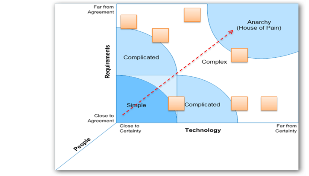 Then we layer on more interesting realizations like the fact that for some endeavors like those approaching the “Anarchy”/“Chaos” domains, probably the best approach would be a “Skunkworks” style cross-functional co-located fully empowered small team. As you grow farther from Anarchy, you can scale agility using an approach like the Scaled Agile Framework. At these levels of uncertainty/risk, the trade-off of distributed teams, distributed PI Planning, system teams, component teams, and shared architects/UX MIGHT make sense and is worth considering.